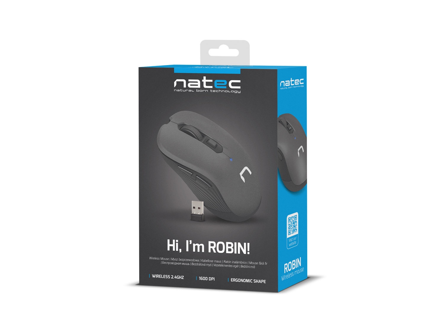 Natec Robin je kompaktní bezdrátová myš vybavená 6 tlačítky a optickým senzorem, který umožňuje precizní a hladkou práci. Senzor umožňuje změnit DPI ve třech úrovních s rozlišením 800/1200/1600 a přizpůsobit zařízení vašim potřebám. Díky kompaktním rozměrům je myš velmi pohodlná při práci doma i v kanceláři nebo při služebních cestách.