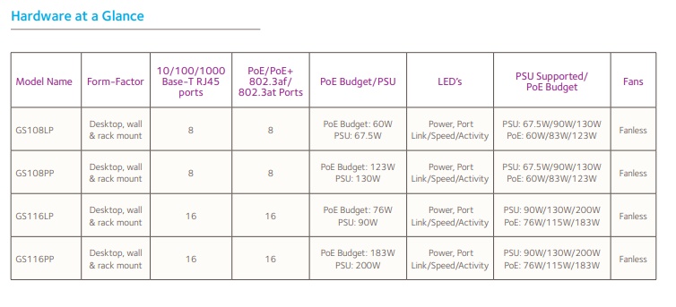 Model Description : GS116PP 16-port PoE+ Gigabit Ethernet Unmanaged switch with 183W total power budget