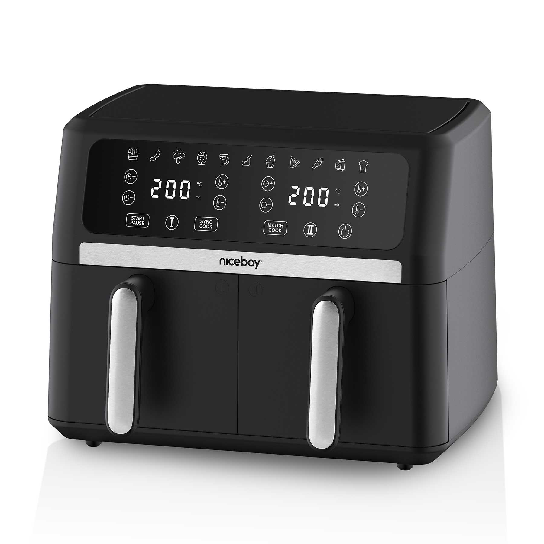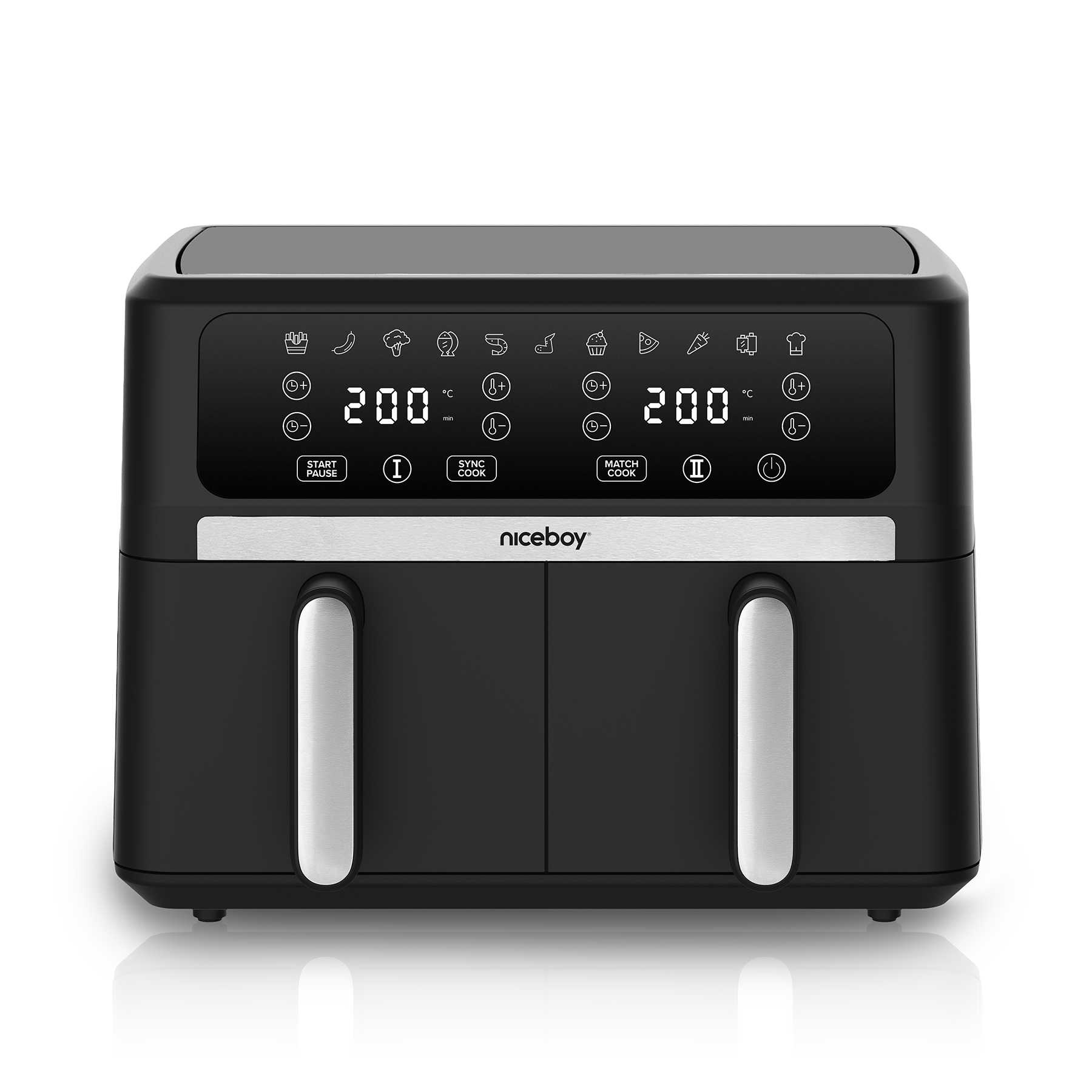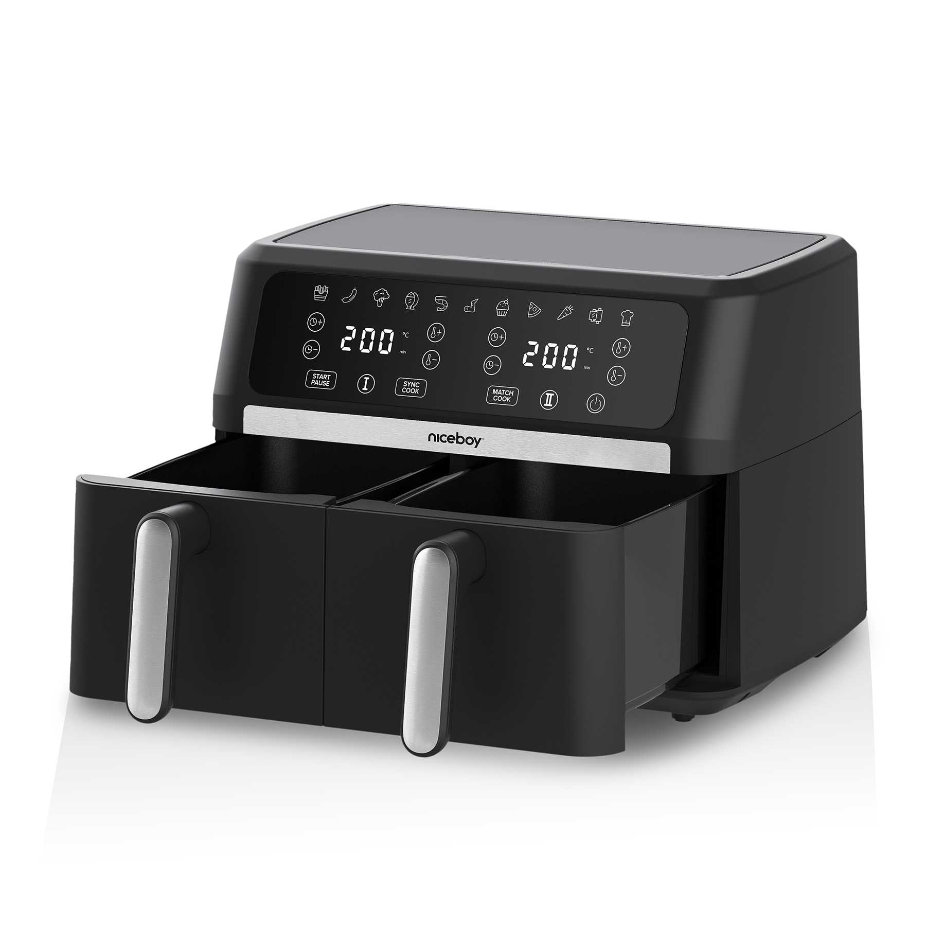 S horkovzdušnou fritézou Niceboy AirFryer DUO připravíš hlavní chod i přílohu najednou. Má totiž ne jeden, ale hned dva oddělené koše – každý o objemu 4,5 litru. Peč, griluj, smaž nebo jenom ohřívej. Ve 2,4kilowattové fritéze horký vzduch cirkuluje, takže oběd, snídani nebo večeři připravíš vždycky rovnoměrně. A navíc s minimem tuku! Rychlé a nutričně vyvážené jídlo už nebude jenom tvoje zbožné přání.