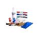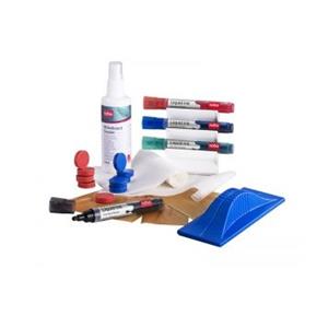 Sada pomůcek k magnetickým popisovacím tabulím v krabici. Vhodné pro všechny typy bílých tabulí stíratelných za sucha.