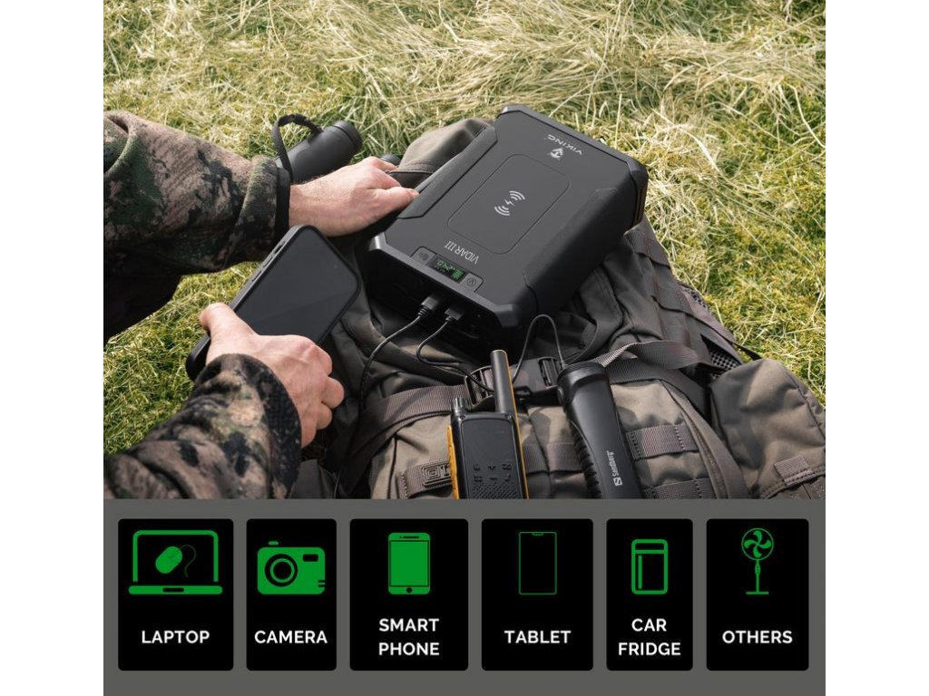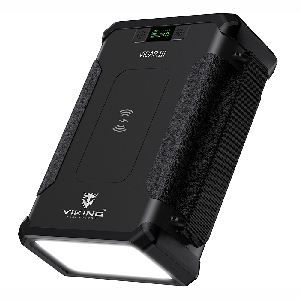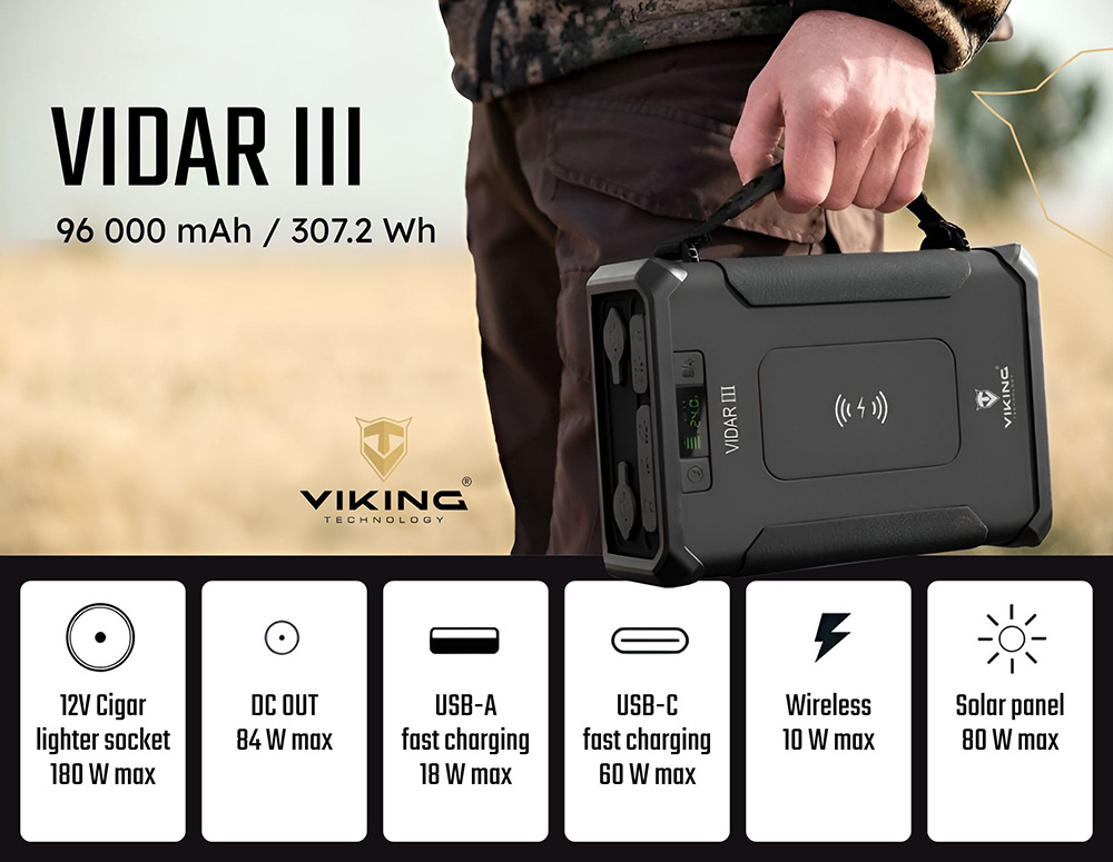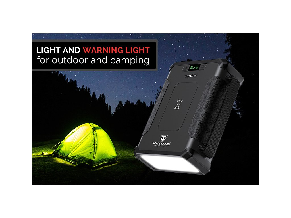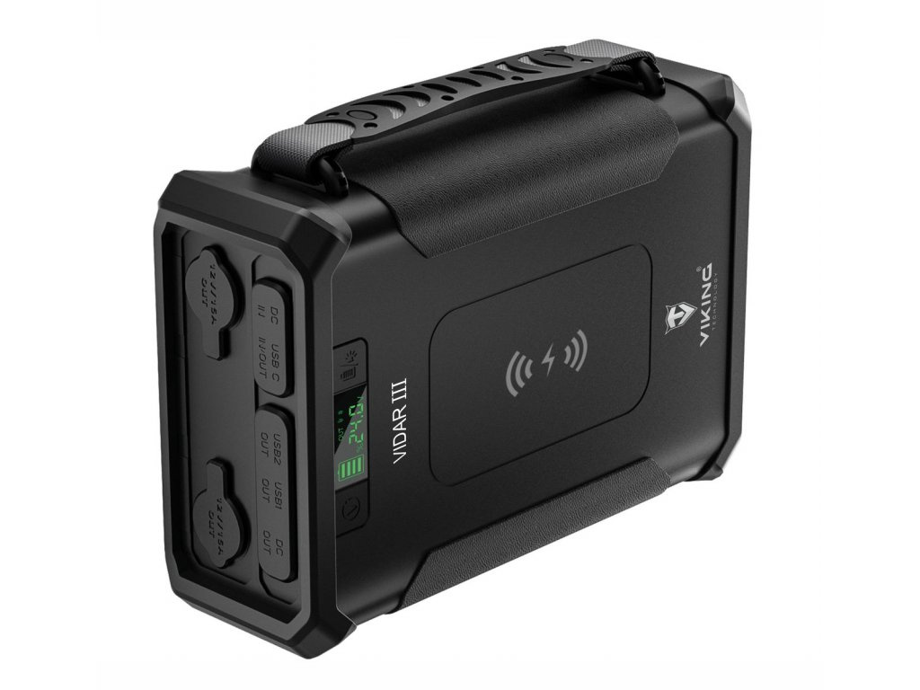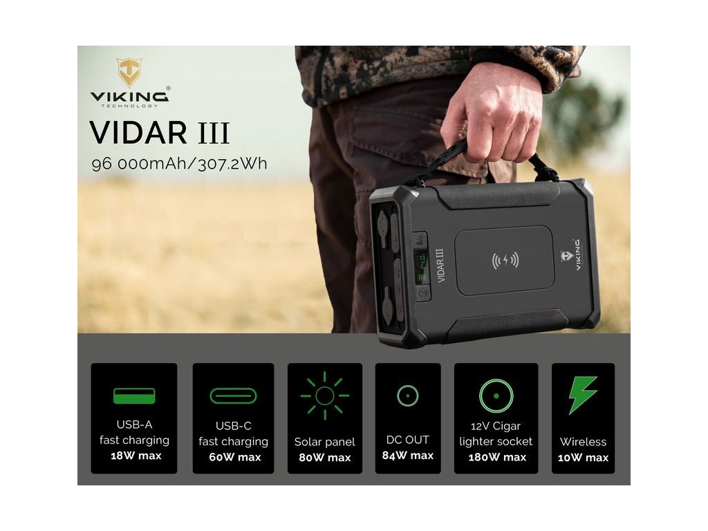 Outdoorová powerbanka Viking VIDAR III • Kapacita: 96000mAh/307.2Wh • Maximální výkon: 180W • Zabudované LED světlo • Široká škála vstupů a výstupů (USB-A, USB-C, Cigaretová zásuvka, DC-jack, WIRELESS Qi) • Možnost solárního napájení • Funkce Pass-Through • Odolnost IP65