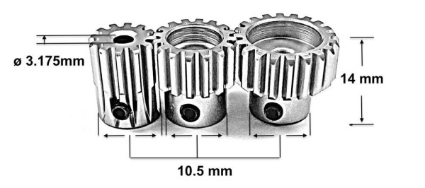 Duralový tvrzený pastorek, balení 1ks Počet zubů: 14Modul: 0,8mm / 32dpOtvor: 3,2mm (3,175mm)Šířka pastorku: 14mmMateriál: tvrzený duralZajištění: červík M3/M4