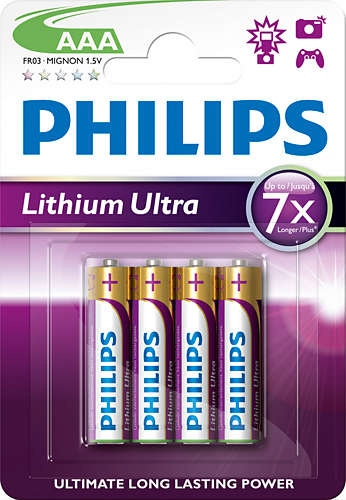 Baterie Philips Lithium Ultra jsou dokonalé pro náročné přenosné přístroje. Vydrží úžasný sedminásobek doby oproti alkalickým typům, což přináší více fotografií nebo více hodin zábavy. Jde zkrátka o dokonalé řešení, na které čekáte.