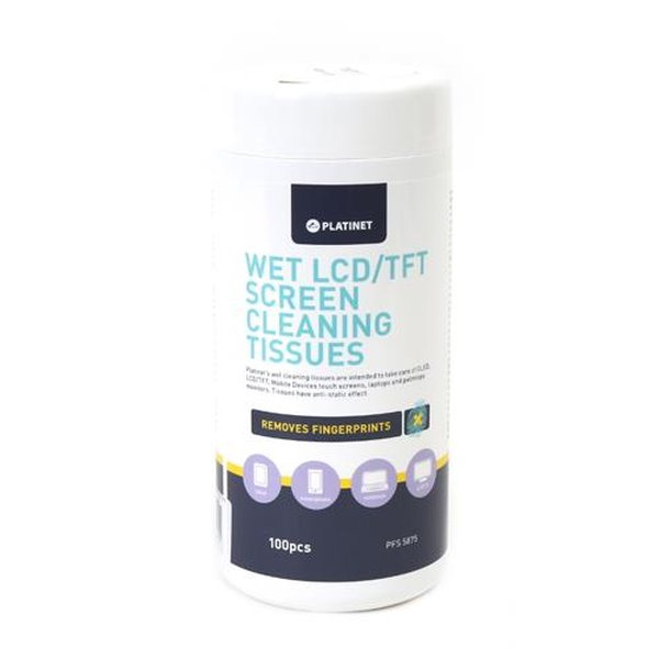 100 vlhčených ubrousků značky Platinet, ideální pro čištění monitorů a obrazovek LCD/TFT vašich televizorů, PC, notebooků, apod. Odstraňují mastné skvrny, otisky prstů a další nečistoty, současně jsou bezpečné a nepoškozují obrazovku.