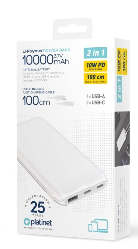 PLATINET POWER BANK 10000 MAH 3,7V 37Wh 10W 2xUSB-C 1xUSB-A WHITE
