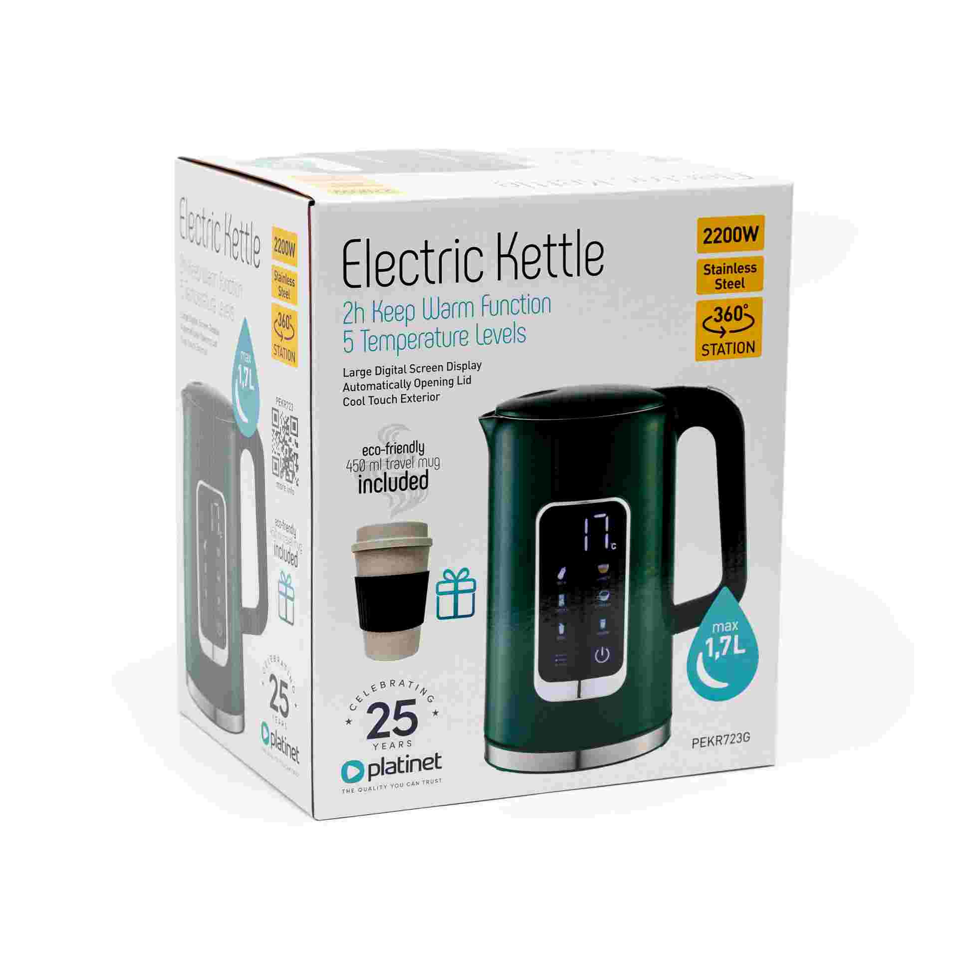 PLATINET RYCHLOVARNÁ KONVICE LCD 1,7L 5 TEPLOT + 450 ML CESTOVNÍ HRNEK, OLIVOVĚ ZELENÁ
