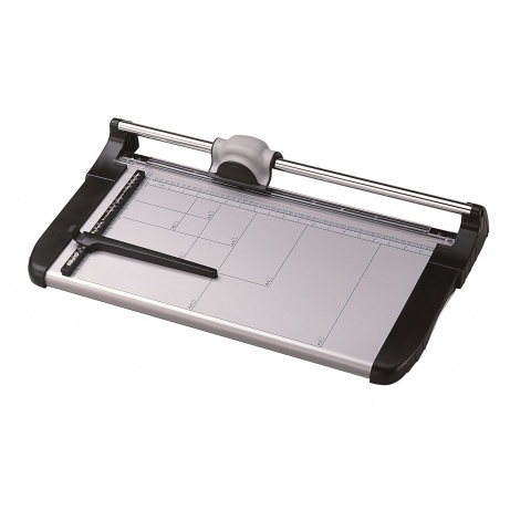 Kvalitní kolečková řezačka s pevnou kovovou základnou a řeznou hlavou umístěnou na kovové tyči, určena pro formát A4. Pracovní stůl je vybaven natištěnými měřítky a posuvnou zarážkou souběžnou s přímk
