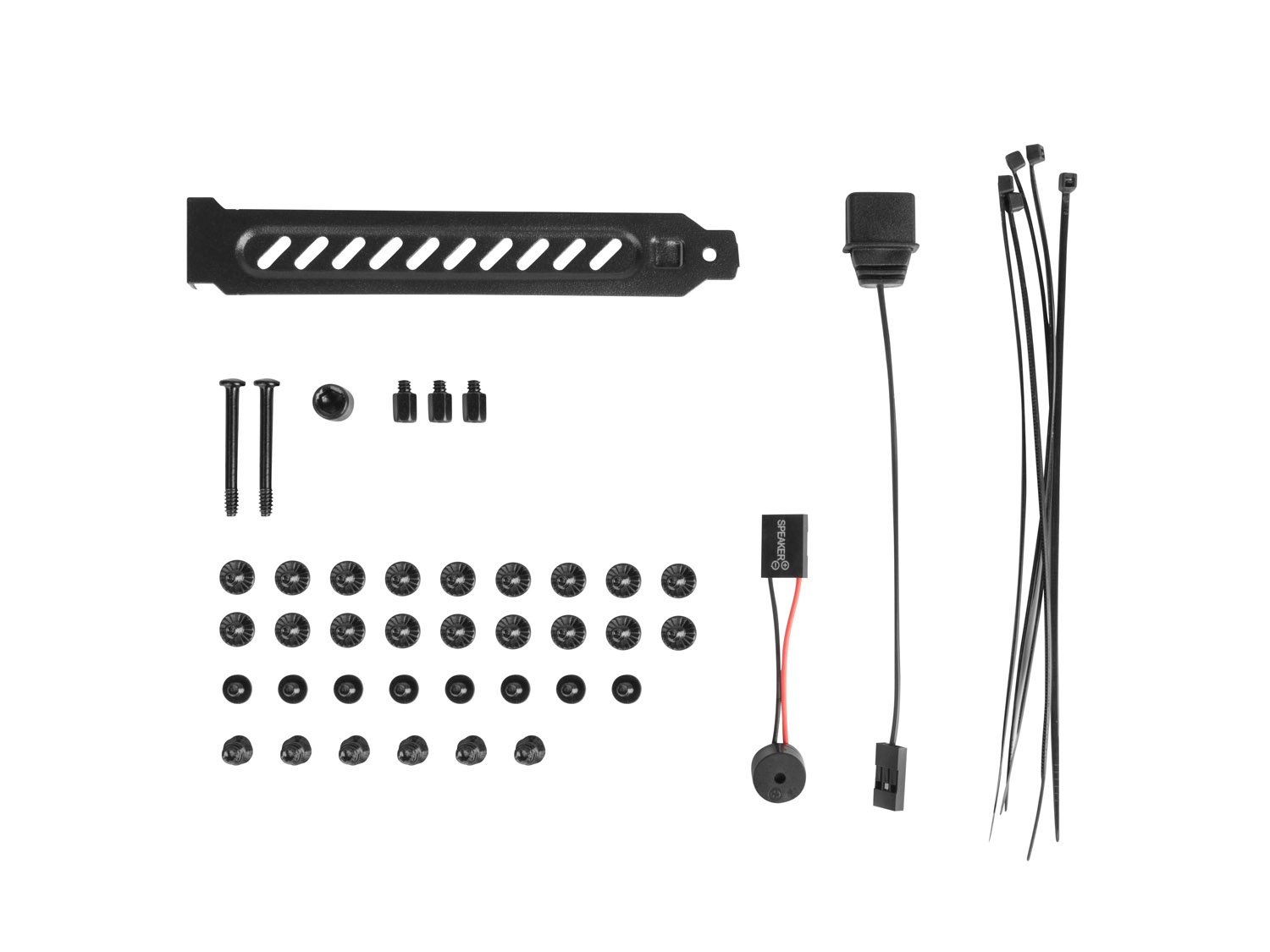 Obsah balení: 1x PC skříň, 3x distanční šrouby pro montáž základní desky, 8x šrouby pro montáž napájecího zdroje, 18x šrouby pro montáž HDD/základní desky, 6x šrouby do rámečku HDD, 5x stahovací pásky, reproduktor, návod k použití, nářadí pro montáž distančních šroubů