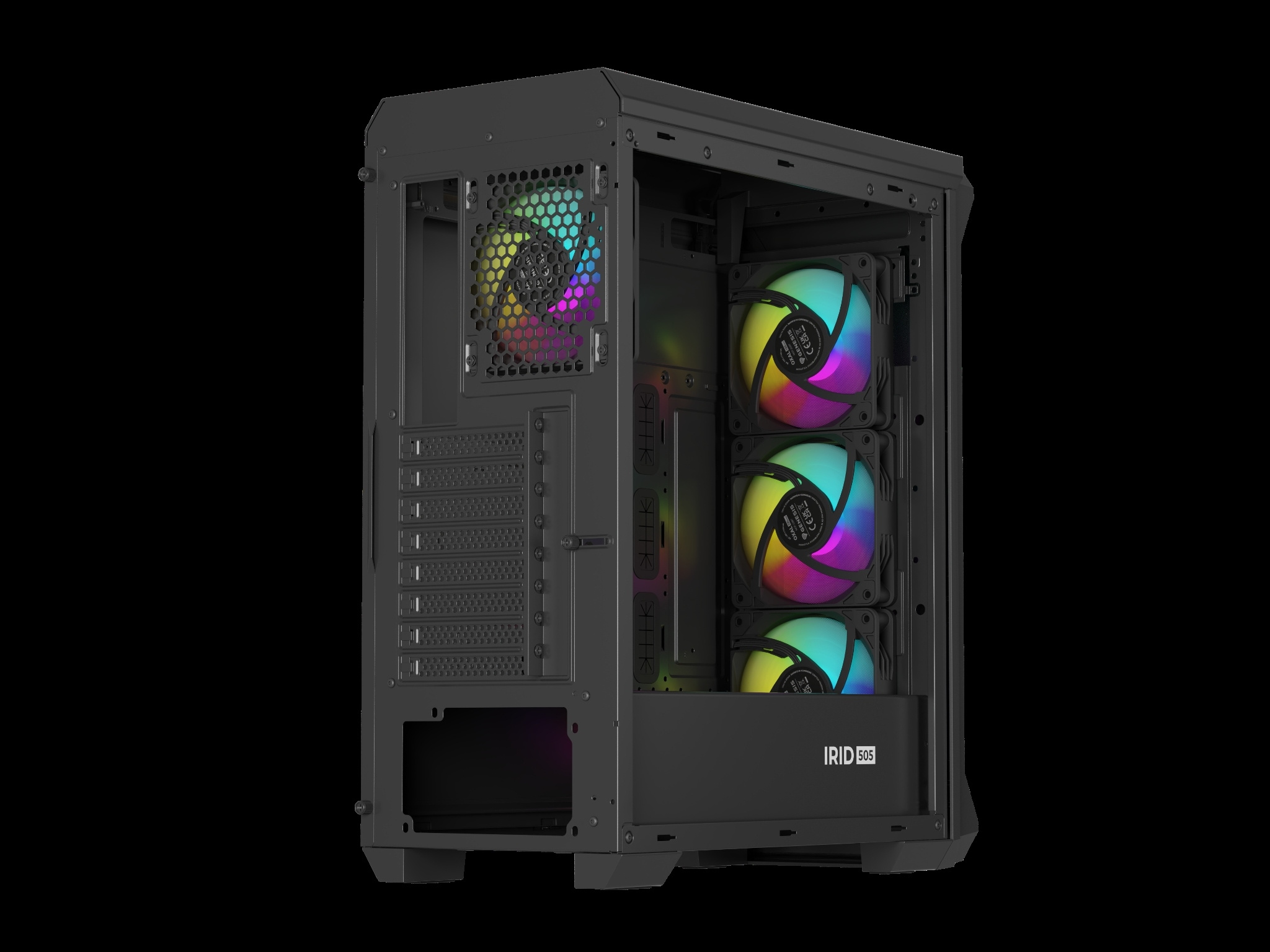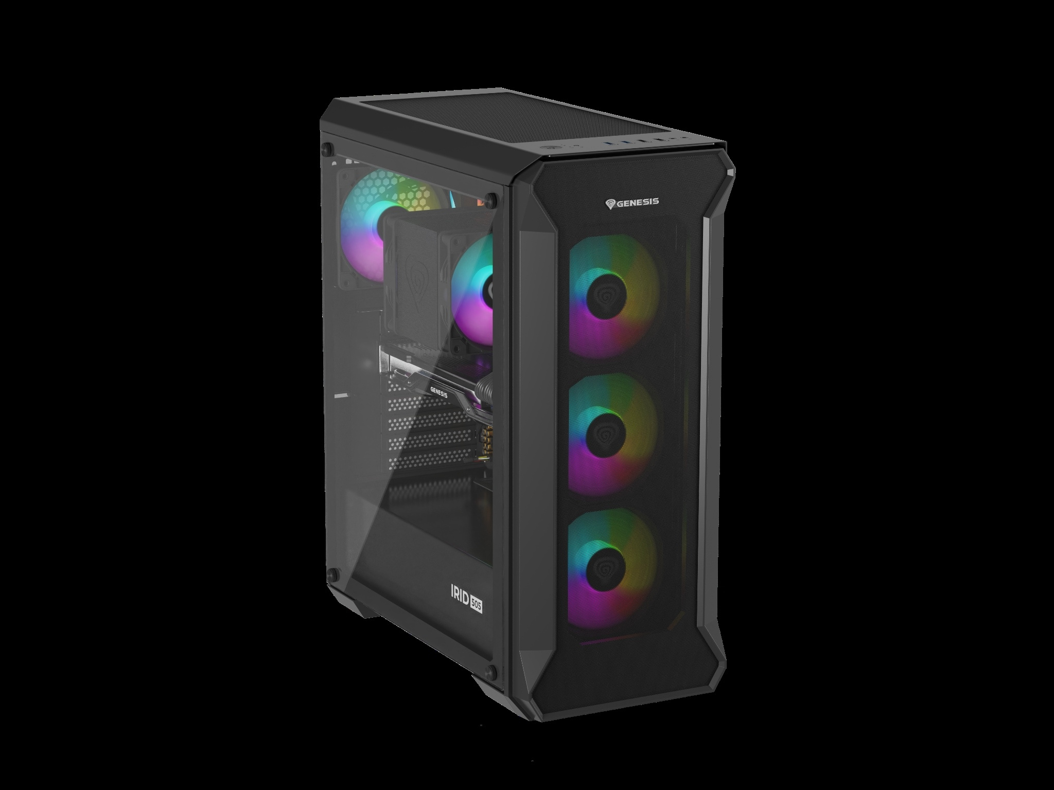 Skříň je vybavena čtyřmi robustními a velmi tichými ventilátory Genesis Oxal ARGB 120. Irid 505 V2 ARGB navíc umožňuje montáž dalších dvou ventilátorů, včetně 140 mm na přední a horní straně. Díky tomu může mít vaše skříň až šest ventilátorů!