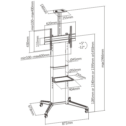 Všestranný pojízdný stojan Brateck T1040T je určen pro instalaci TV s plochou obrazovkou s úhlopříčkami od 37“ do 70“ a hmotností až 50 kg. Stojan poskytuje stabilní podporu a díky integrovaným kolečkům s možností aretace zároveň umožňuje snadné a bezpečné přemístění dle potřeby. Montážní deska pro upevnění TV je nastavitelná ve čtyřech různých výškových úrovních, jednoduchá změna náklonu TV v rozsahu +5°~-12° pak umožňuje nastavení optimálního pozorovacího úhlu. Stojan je navíc vybaven jednou výškově stavitelnou poličkou na kameru s nosností 5 kg a jednou výškově nastavitelnou poličkou na příslušenství s nosností 5 kg. Díky tomuto příslušenství je stojan vhodný pro pořádání telekonferencí, ale také pro využití při kancelářských a školních prezentacích, nebo při domácí zábavě.