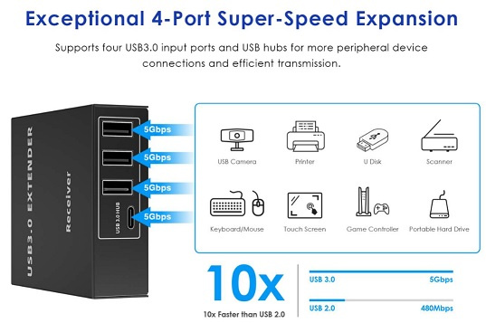 Tento extender překračuje omezení maximální vzdálenosti USB kabelu a umožňuje zapojit všechny USB periferie do vzdálenosti až 100m za pomoci kabelu Cat5e/Cat6/Cat6A.