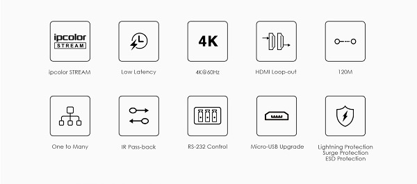 Zařízení umožňuje po jednom síťovém kabelu nebo prostřednictvím LAN sítě přenést nekompreovaný 4K@60Hz HDMI signál až na 120m a současně IR signály.