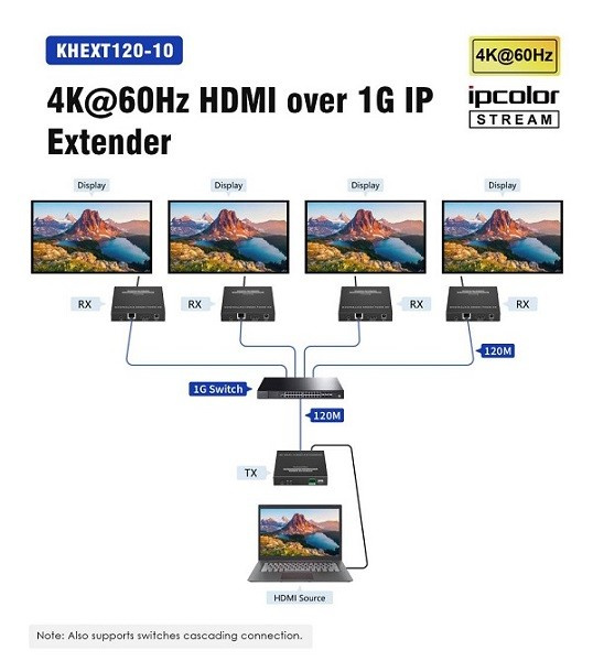 - Extender umožňuje použití jednoho vysílače a více přijímačů vzájemně propojených pomocí LAN sítě, switchů a routerů (otestováno na 4k@60hz a FULL HD 1080p a 60m kabelu + swich + 2 přijímače) tato počítačová síť musí být vyhrazena pouze pro HDMI extendery, nesmí sdílet další počítače, tiskárny a jiná síťová zařízení.
