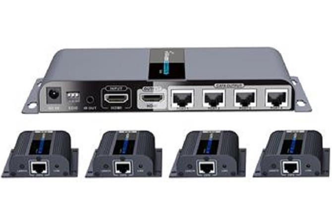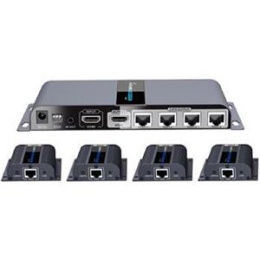 Extender se skládá z jedné vysílací jednotky s lokálním výstupem HDMI a čtyř přijímačů, které se propojí CAT6/6a/7 kabelem s vysílačem.