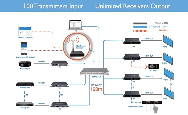 - 4 způsoby ovládání - IR dálkové ovládání, tlačítka, ovládání PC pomocí softwaru a aplikace pro bezdrátové ovládání (je nutný ovladač HDbitT Matrix) pro přepínání mezi různými zdroji ze strany přijímače, jako by se měnily televizní kanály. K ovládání funkce APP je nutný řadič HDbitT Matrix.