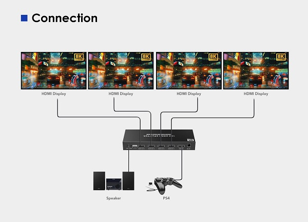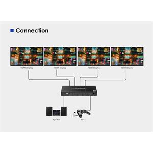 - Automatická inteligentní správa EDID umožňuje připojit na výstupu různé monitory, které podporují rozlišení 8K nebo 4K nebo FULL HD 1080p