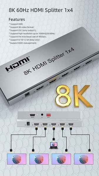 Splitter podporuje HDMI signál s rozlišením až 8K@60Hz, 4K@120Hz nebo FULL HD 1080p