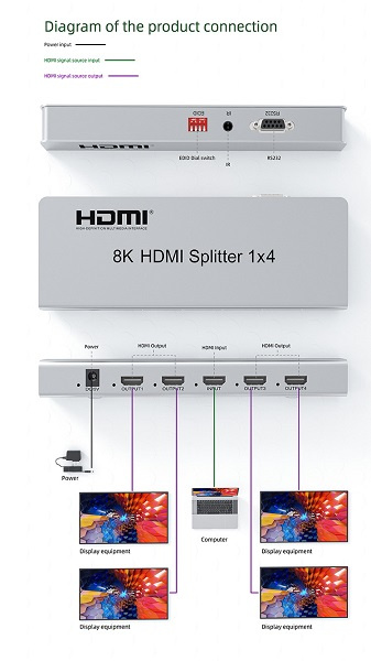 - Přepínač a správa EDID umožňuje připojit na výstupu různé monitory, které podporují rozlišení 8K nebo 4K nebo FULL HD 1080p