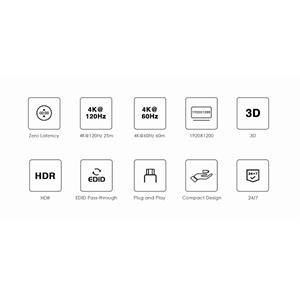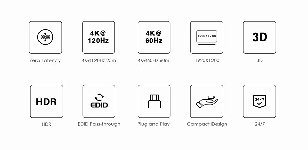- Podporuje 4K@60Hz na 60m a 4K@120Hz na 30m a FULL HD 1080p až na 60m při použití kvalitního UTP kabelu CAT6 s měděnými vodiči AWG23