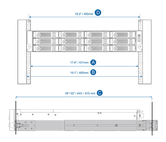 D. Vzdálenost mezi dvěma rackovými sloupky (měření čtvercových otvorů racku střed-střed) je 18,3"(465 mm)
