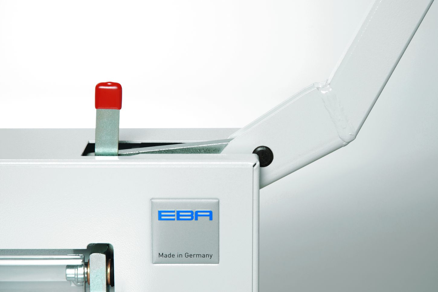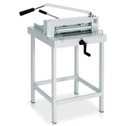 Mechanická stohová řezačka vysoce kvalitního provedení značkového výrobce EBA, řezání až do formátu A3, délka řezu 430 mm, výška stohu 40 mm, hloubka vložení stohu 435 mm.