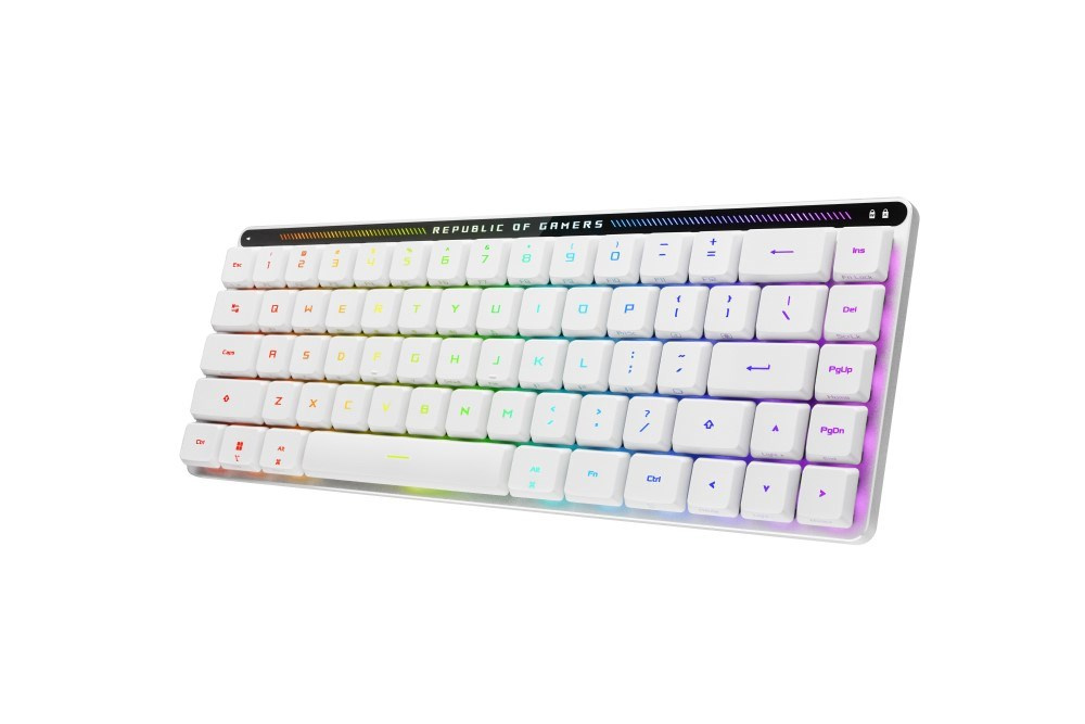 ROG Falchion RX Low Profile 65% kompaktní bezdrátová herní klávesnice s nízkoprofilovými optickými spínači ROG RX, třírežimové připojení s bezdrátovou technologií ROG SpeedNova a přijímač Omni, ochranný kryt, integrovaná silikonová tlumící pěna, interaktivní dotykový panel a podpora MacOS