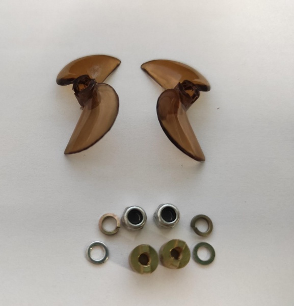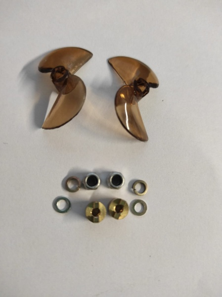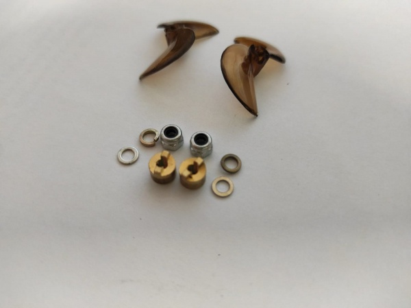 Sada lodních šroubů pro bitevní lodě Součástí sady je levý a pravý lodní šoub s maticemi a podložkami. V sadě: 1 x levý lodní šoub + matice, podložka, matice, podložka2 x pravý lodní šoub + matice, podložka, matice, podložkaPrůměr lodního šroubu 3,1 cm, průměr otvoru pro hřídel je 3 mm