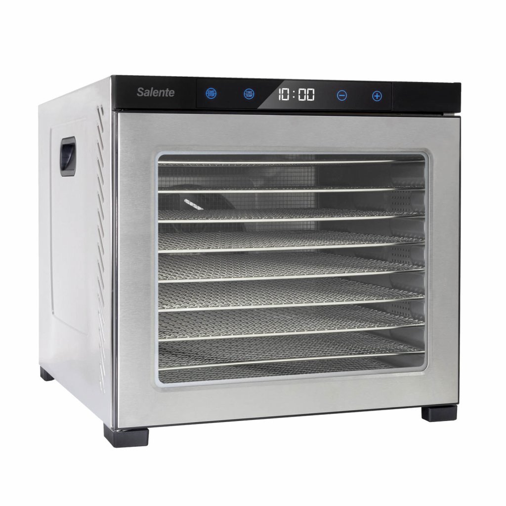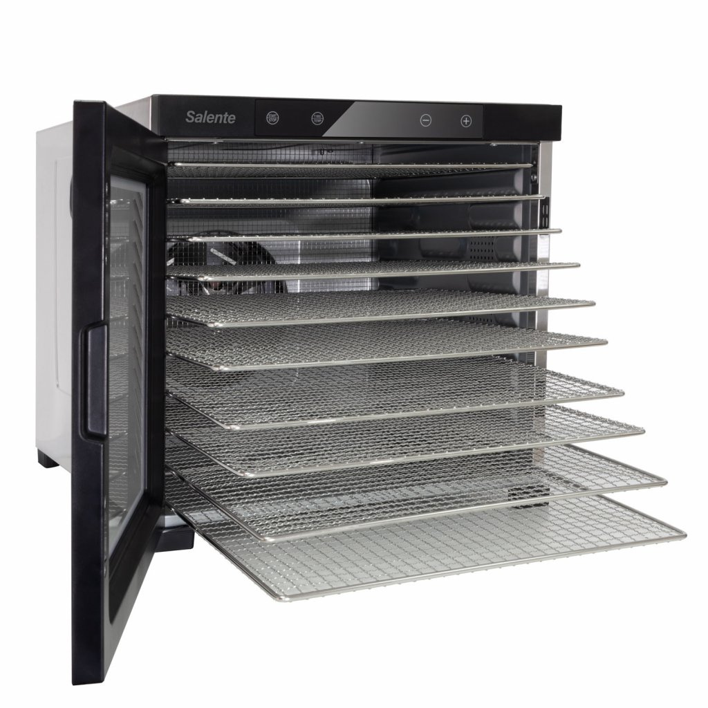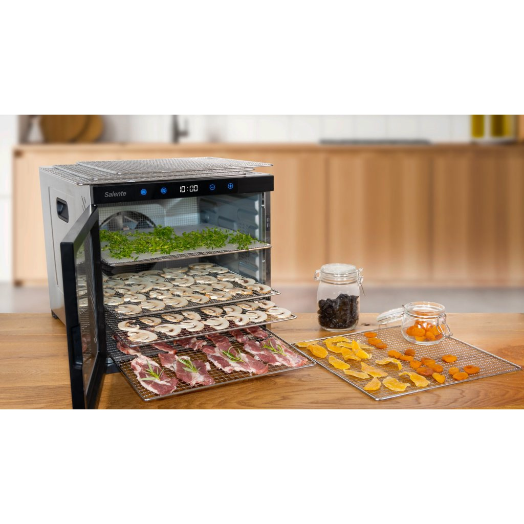 Celonerezová profesionální sušička Salente QuickDry nabízí rovnoměrné sušení hub, ovoce, zeleniny, bylinek, čaje a dalších surovin s maximálním uživatelským komfortem díky senzorickému dotykovému ovládacímu panelu s digitálním displejem a velmi jednoduchým nastavením teploty i času s možností libovolné změny nastavených hodnot i v průběhu sušení. Teplotu lze nastavit v rozsahu 35-75 °C v krocích po 5 °C, čas lze nastavit v rozsahu 30 min. až 24 hodin v krocích po 30 minutách. Díky použitým materiálům má prodlouženou životnost a velmi snadno se udržuje a čistí.