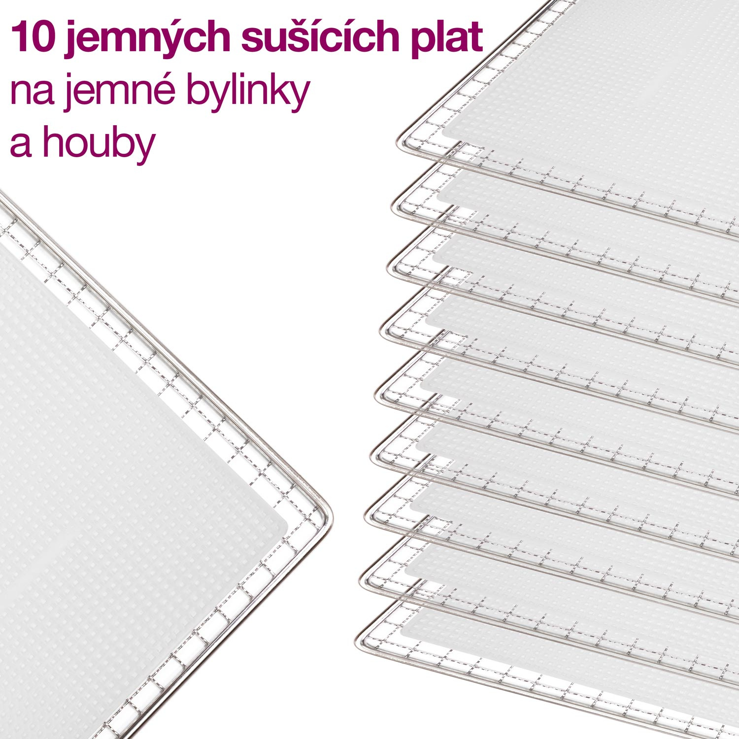 • 10 vložek na plata s jemným síťováním pro sušení jemnějších a lepkavých surovin (např. hub, bylinek, banánů, rajčat atp.)