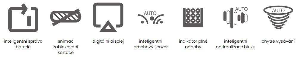 Soustava čidel ve spojení s barevným digitálním displejem informuje uživatele o všem podstatném. Zobrazí stav baterie při vysávání nebo nabíjení, zvolený pracovní režim, potřebu vyprázdnit nádobu na prach nebo zablokovaný rotační kartáč.