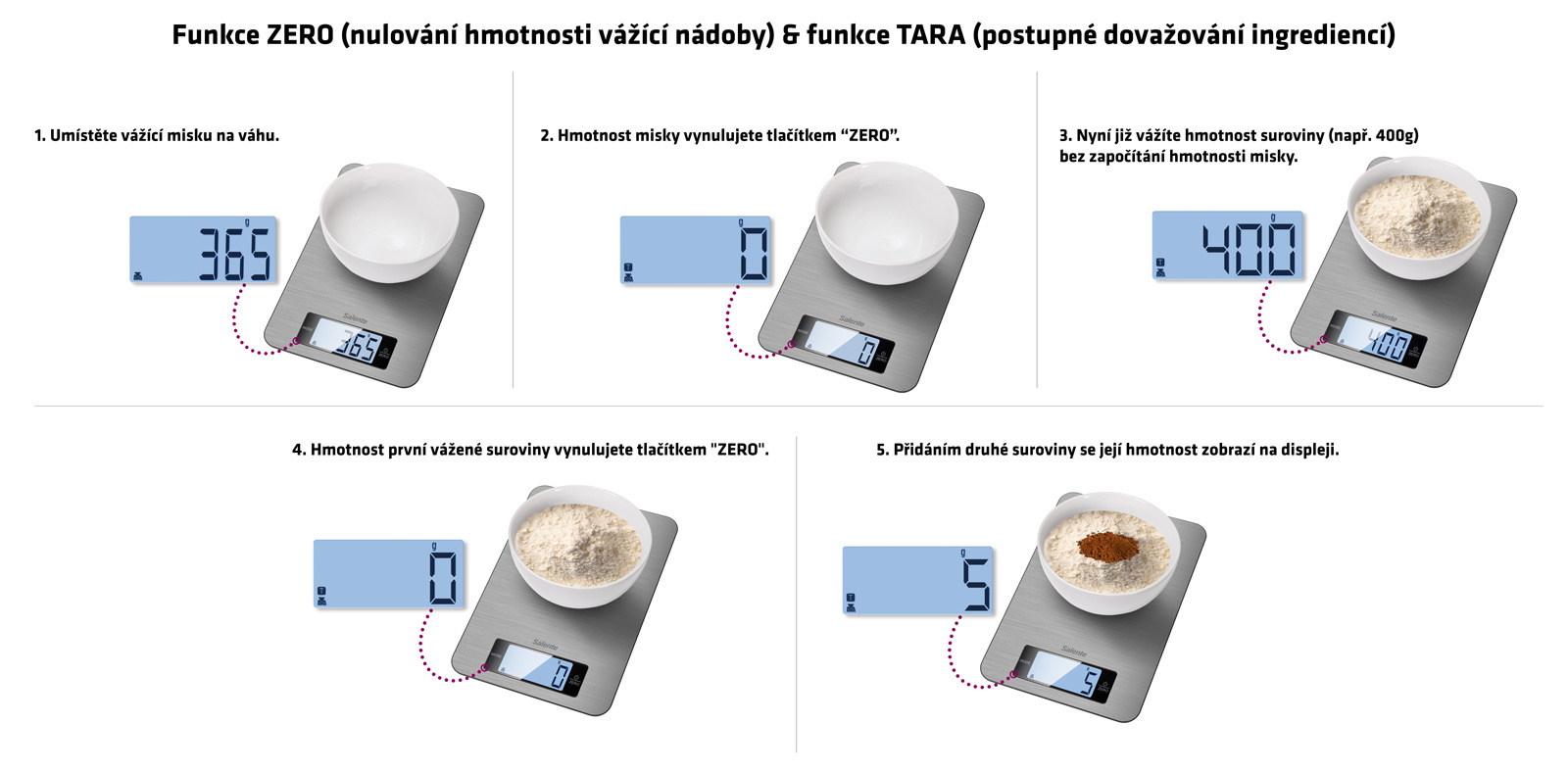 Funkce ZERO (nulování hmotnosti vážicí nádoby) & funkce TARA (postupné dovažování ingrediencí)