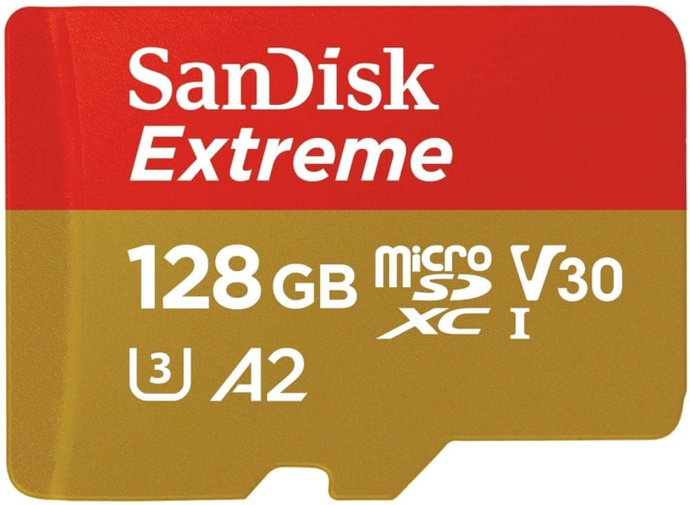 Ultra rychlá paměťová karta typu microSDXC Extreme UHS-I V30 C10 A2 s kapacitou 128 GB, 160 MB/s čtení, 90 MB/s rychlost zápisu, volně stažitelná aplikace SanDisk Memory Zone app, součástí adaptér na velikost SD. Doporučené použití: pro akční kamery.