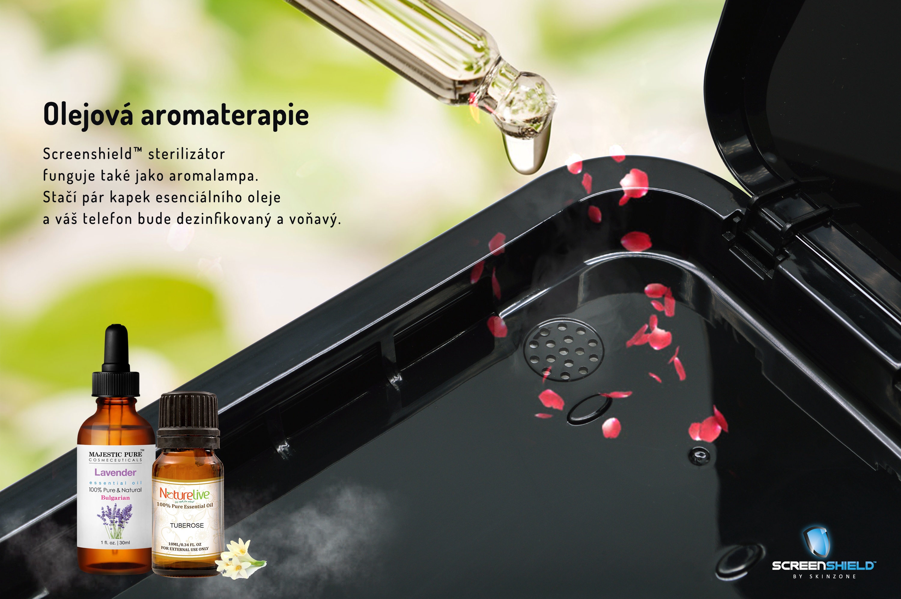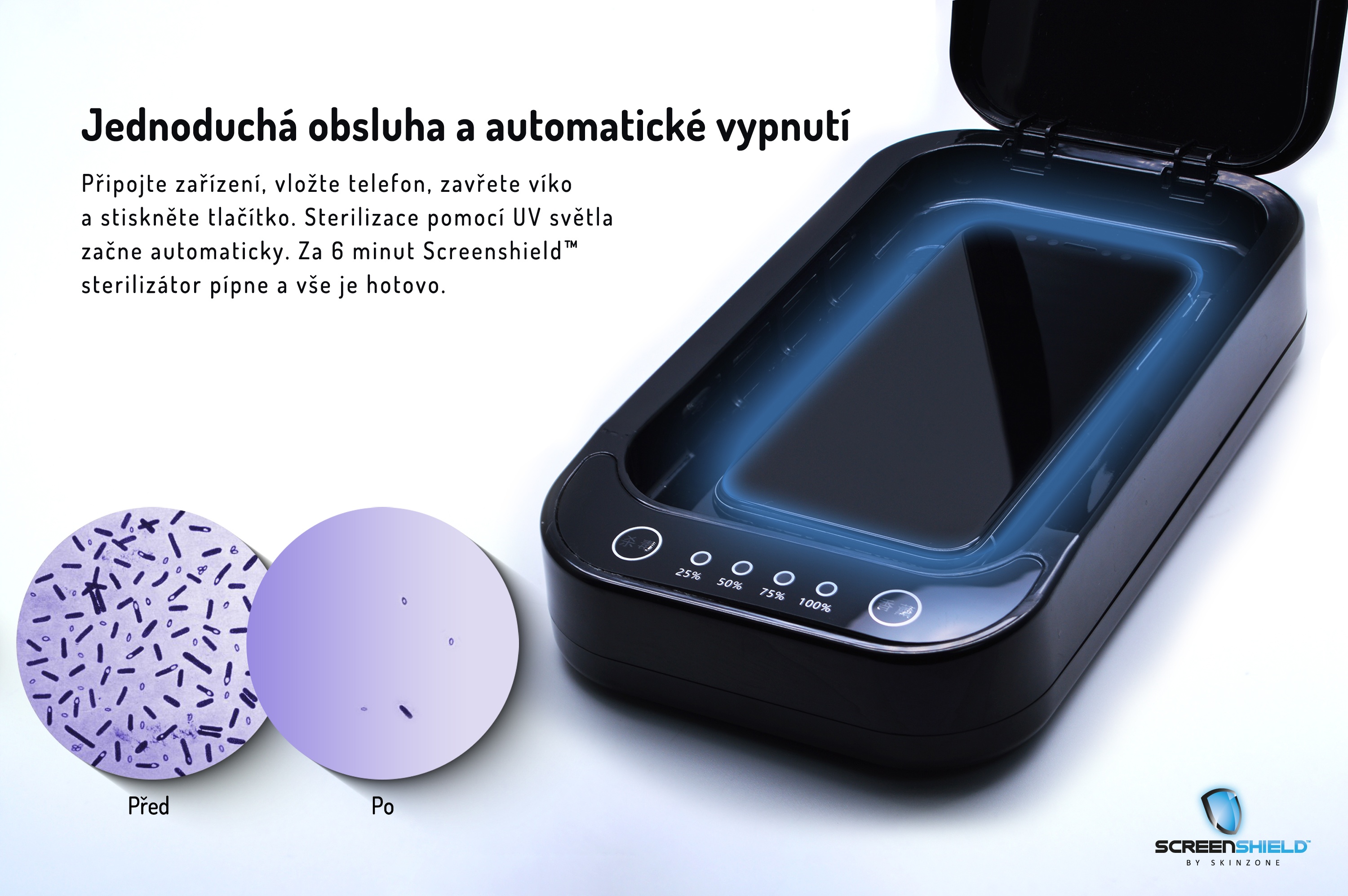 Screenshield™ přenosný UV sterilizátor eliminuje 99,99 % bakterií na mobilních telefonech, klíčích, špercích, bižuterii a jiných zařízeních do velikosti 180 × 100 × 22 mm. Podle průzkumů se na mobilním telefonu usazuje až 1 milion bakterií (cca 20 000 na 1 cm2). Toto šikovné zařízení pracující na bázi UV světla bakterie zničí během 6-10 minut a to zcela jednoduchým a téměř bezobslužným způsobem.