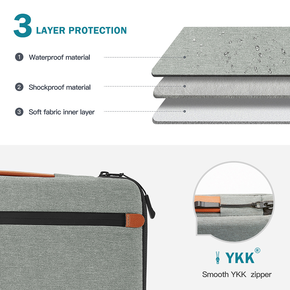 Taška je vyrobena ze tří vrstev textilie - vnější voděodolný materiál, který odolá cákancům vody, střední nárazu vzdorný materiál a vnitřní měkký materiál. Díky těmto třem textiliím máte jistotu, že je vaše zařízení v bezpečí za všech okolností. Rohy brašny jsou navíc opatřeny ochranou rohů zařízení.