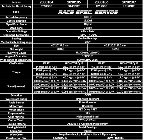 Silné a rychlé voděodolné servo vhodné pro všechny typy modelů 1:10, buggy 1:8, expedice, apod. Velmi rychlé a silné servo s hliníkovo-plastovým boxem pro maximální pevnost a odolnost. Standardní provedení. Servo je vodotěsné dle standardu IP65 (odolné proti vodě stříkající pod proudem po dobu max. 3min, max odolnost proti prachu). Parametry serva (neutrální poloha, max. výchylka, rychlost, změna směru otáčení, ochrana proti přetížení apod.) je možné v PC prostřednictvím USB interface upravit a přizpůsobit svým potřebám. USB interface není součástí balení. Servo je po zakoupení plně funkční, chová se jako standardní servo a není nutné ho nijak nastavovat a programovat. Převody: kovové, ocelové Tah 14 - 17,5kg/4,8 - 8,4V Rychlost 0,08 - 0,058s (dle napájení) Hmotnost: 73g Ložiska: 2x (výstupní hřídel) Konektor: JR/Graupner Výstupní hřídel: 25 zubů (Futaba) Napájecí napětí: 4,8 - 8,4VBox: kombinace hliník / plastElektromotor: střídavý, bezuhlíkový Součástí balení jsou 3 pevné plastové páky