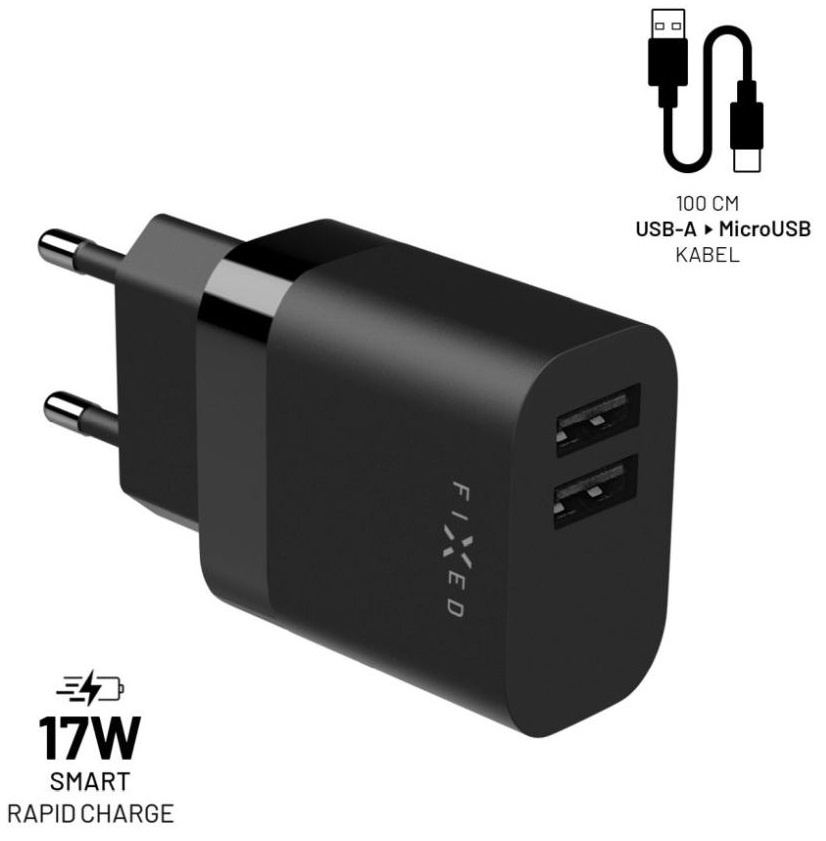Set síťové nabíječky FIXED s 2xUSB výstupem a USB/micro USB kabelu, 1 metr, 17W Smart Rapid Charge, černá