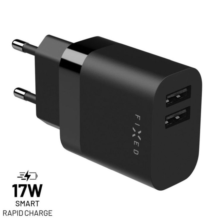Síťová nabíječka FIXED s 2xUSB výstupem, 17W Smart Rapid Charge, černá