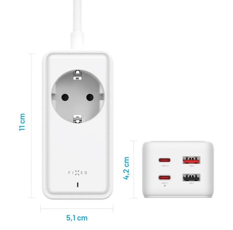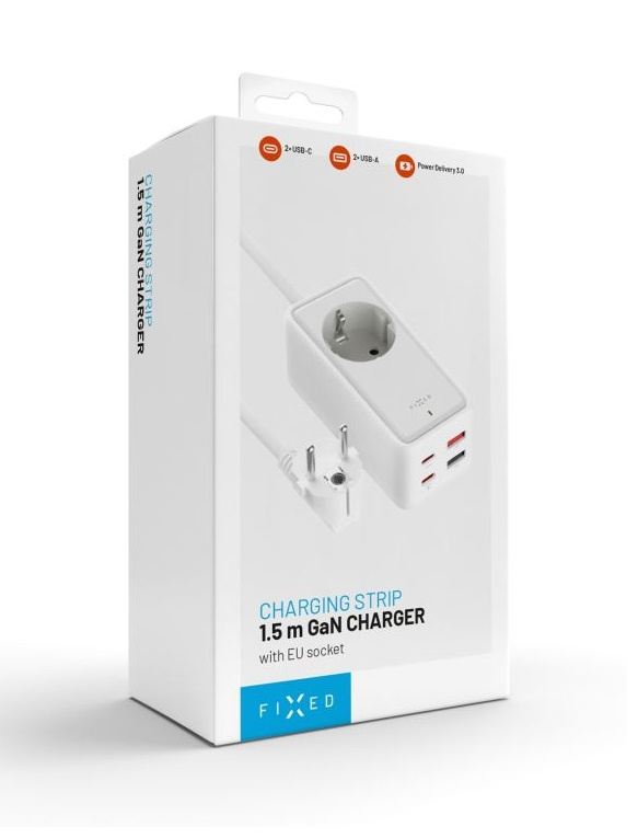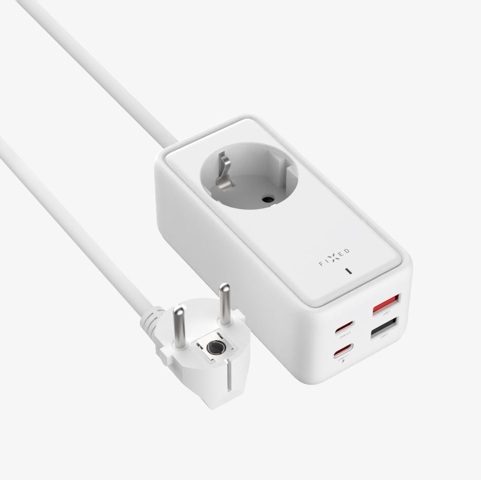 Síťový prodlužovací adaptér FIXED Charging Strip s 2x USB-C a 2x USB, GaN III, 1.5m, PD 65W, bílý