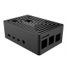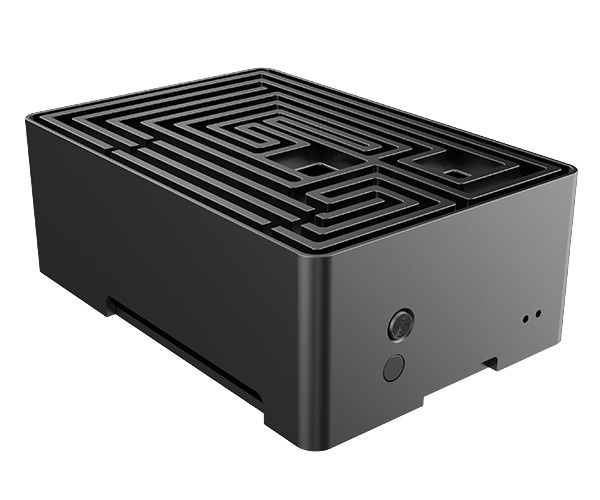 Černá eloxovaná skříň s nápadným designem bludiště nahoře. Vestavěné duální hliníkové jádro tiše chladí Raspberry Pi 4. Je vybavena přeprogramovatelným tlačítkem napájení a skrytou kartou SD pro komerční produkci systému.