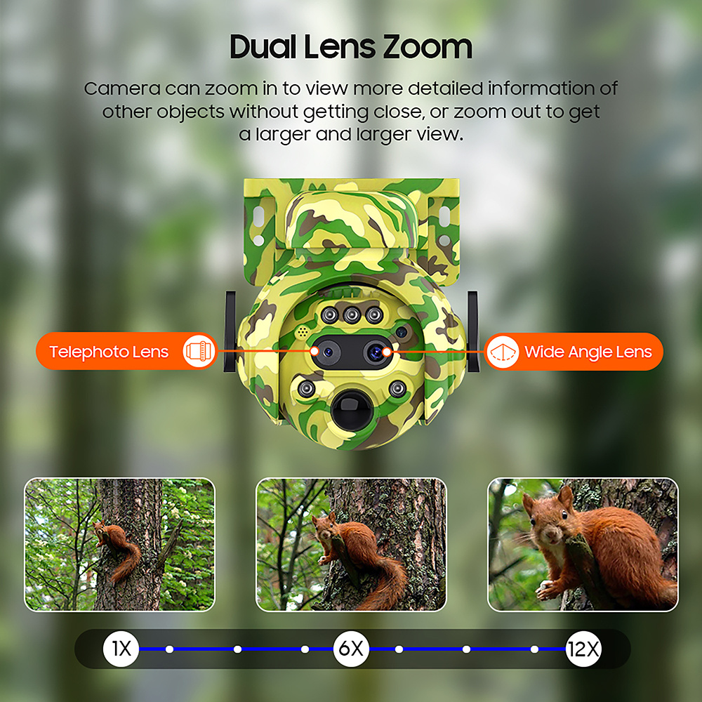 2304 x 1296 rozlišení · 4G připojení · 12x manuální zoom · PIR detekce - pohybový senzor · podpora TF karty až 128GB · cloudové úložiště · aplikace UBOX · kapacita baterie 7800 mAh · dvousměrný přenos zvuku · PTZ otočná kamera 355°/90° · solární napájení · mobilní notifikace · IR a bílé LED osvětlení · funguje pouze se SIM kartou 4G · ovládání přes mobilní aplikaci