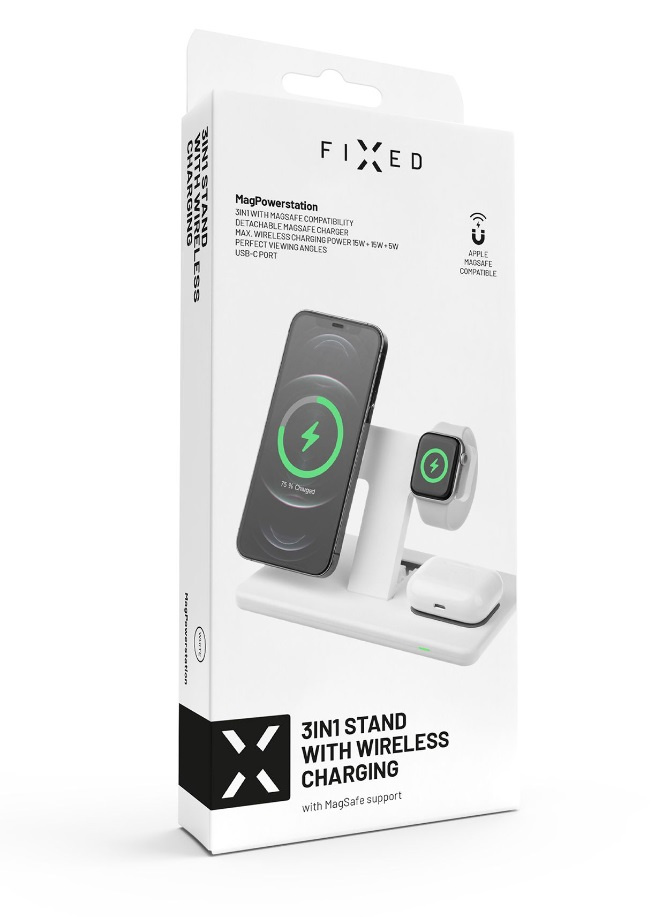 FIXED MagPowerstation je moderní bezdrátová nabíječka s podporou funkce MagSafe navržená přímo pro váš Apple iPhone, hodinky Apple Watch a sluchátka Apple Airpods. Kompletně se postará o rychlé a bezpečné dobití všeho důležitého na váš běžný den.