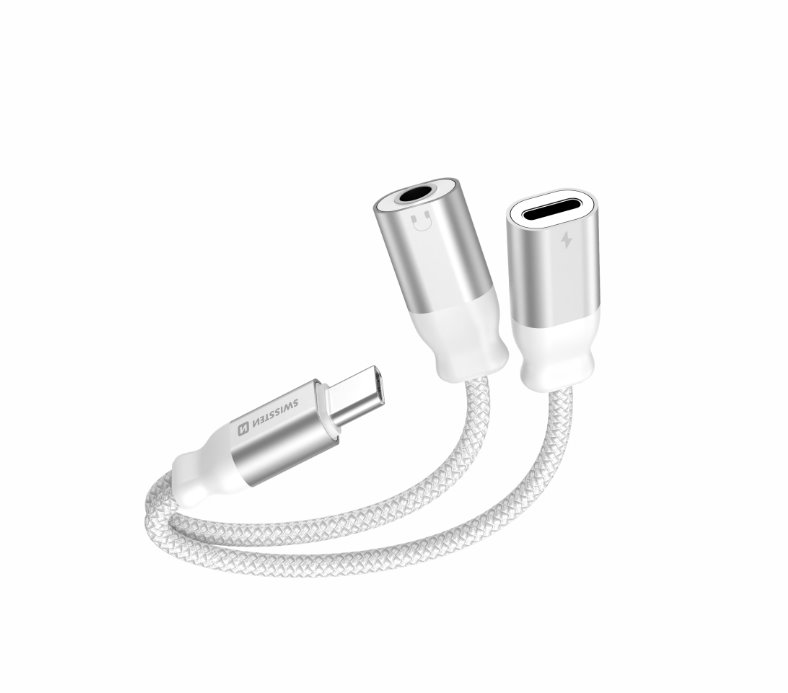 SWISSTEN NABÍJECÍ AUDIO ADAPTÉR TEXTILE USB-C (samec) / USB-C (samice) a 3,5mm AUX 0,12 M BÍLÝ