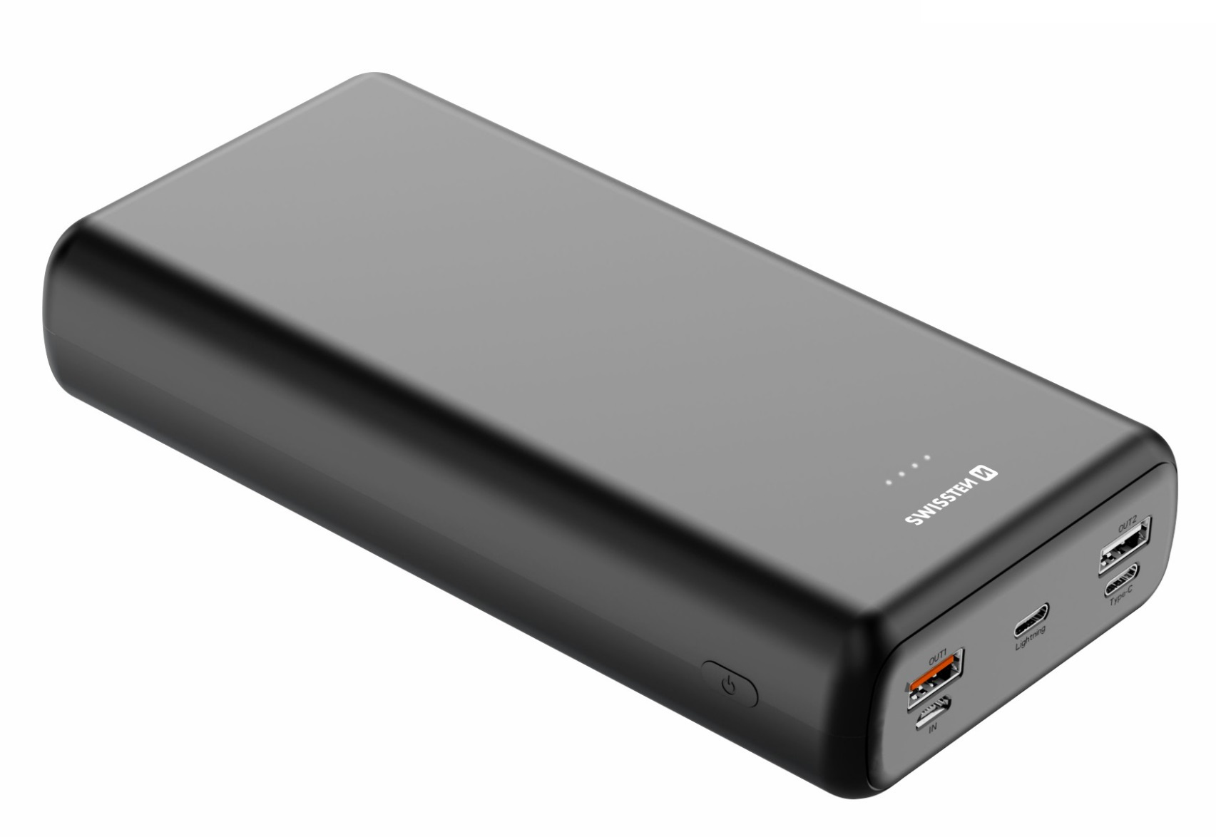 Powerbanka SWISSTEN s kapacitou 30.000 mAh se vstupy microUSB, USB-C i lightning a výstupy 2xUSB-A, USB-C a rychlým dobíjením PD a QC. Baleno v blistru SWISSTEN.