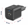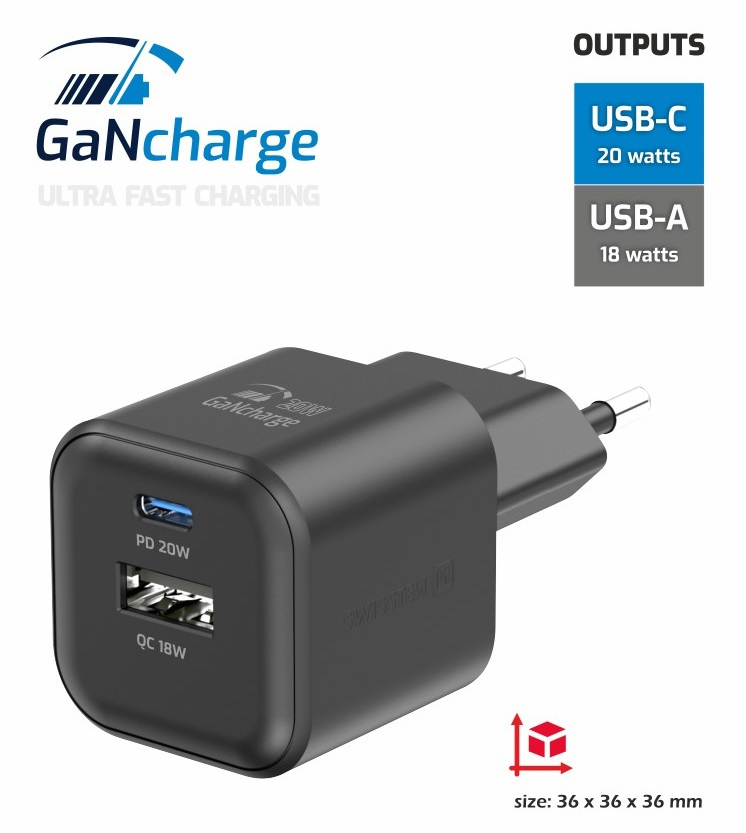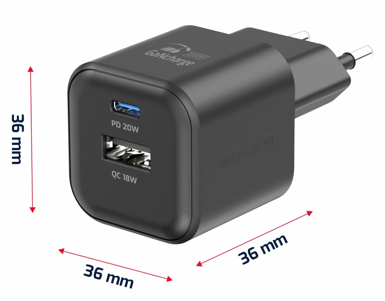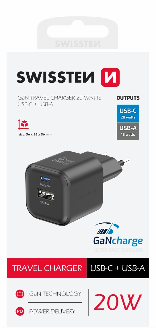 SWISSTEN SÍŤOVÝ ADAPTÉR GaN 1x USB-C 20W PD + 1x USB-A 18W QC ČERNÝ