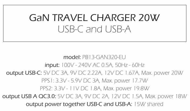 USB-A QC 3.0: 5V DC 3A, 9V DC 2A, 12V DC 1.5 A, Max. 18W