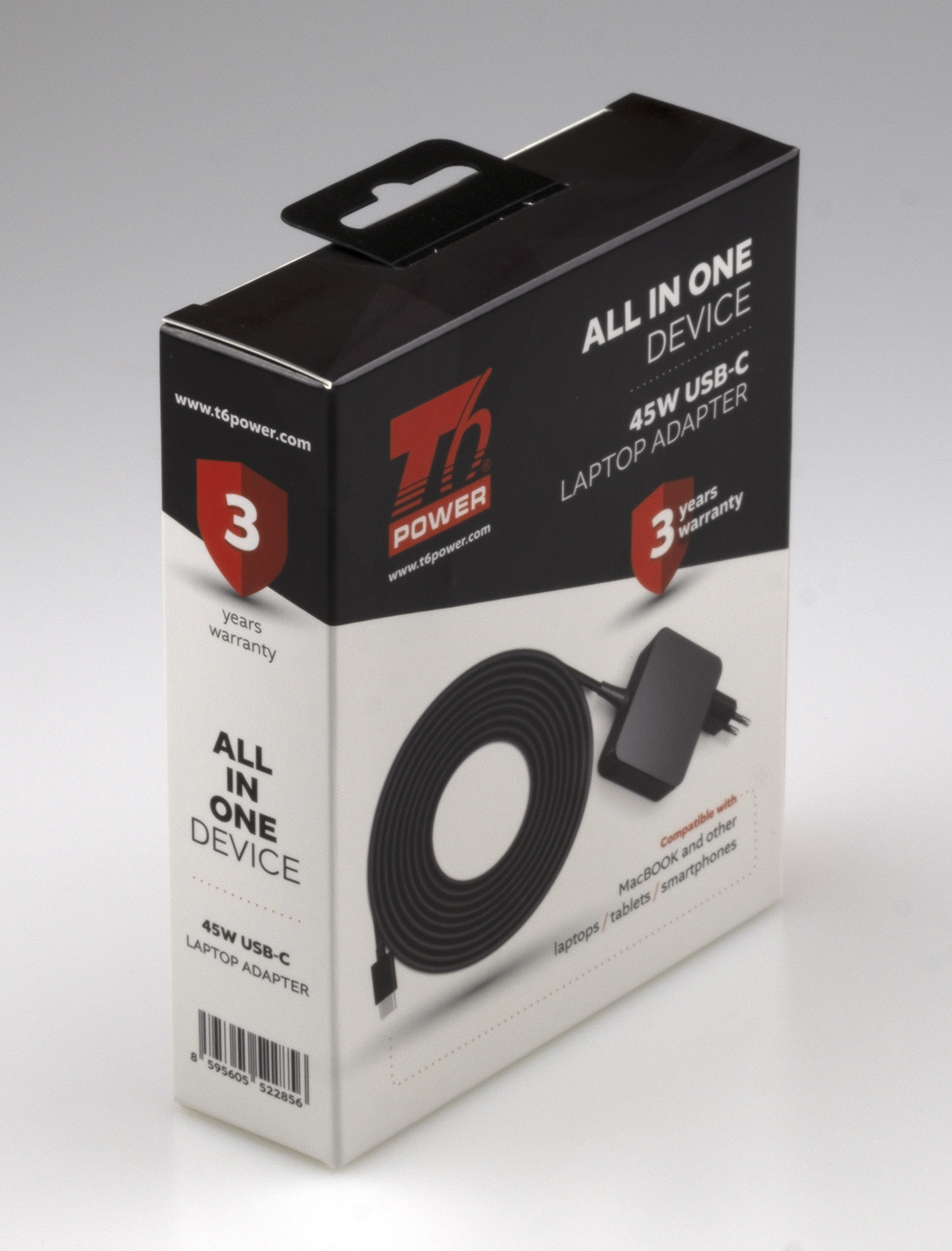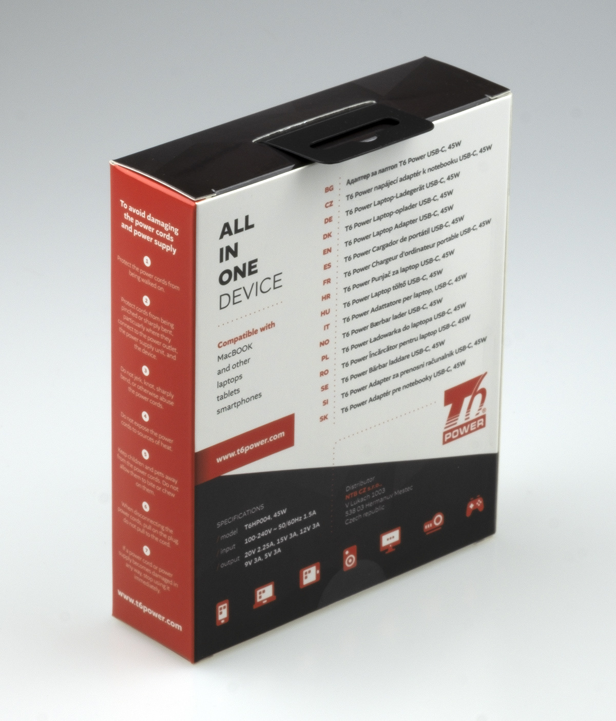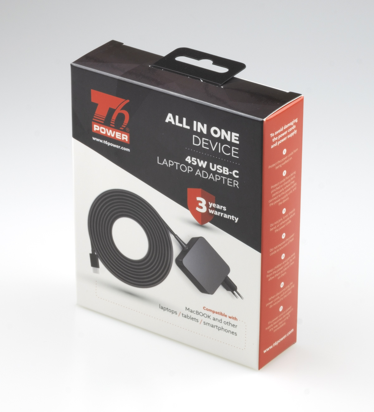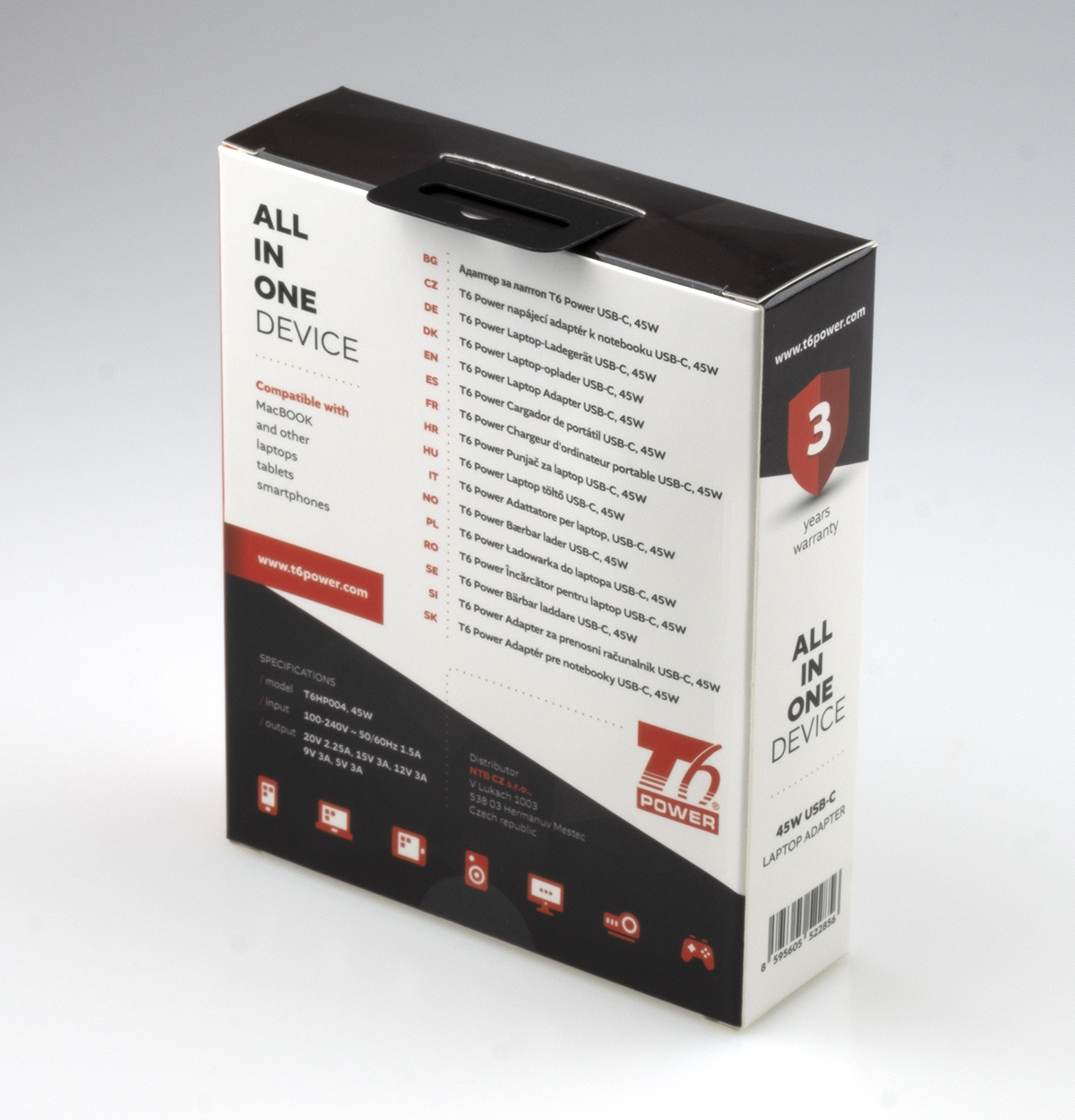 Univerzální adaptér značky T6 Power s výkonem 45 W je ideálním zdrojem energie pro notebooky, ultrabooky, MacBooky, tablety, mobílní telefony, monitory, atd.