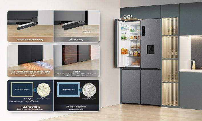 Dveře chladničky lze otevírat a zavírat v úhlu 90°. Umožňuje pohodlný přístup k potravinám uloženým v chladničce a hodí se spíše do různých designů domácností.