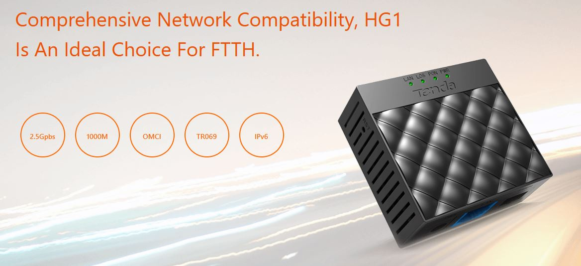 Tenda HG1 je plně kompatibilní se standardy ITU G.984, ITU G984.2, ITU G984.3, ITU G984.4 pro konverzi XPON SC/APC optické trasy s vysíláním TX 1310nm a příjmem Rx 1490nm. Tuto optickou část konvertuje na metalickou část s RJ45 portem. Tenda HG1 je napájena napájecím adaptérem 9V DC, který je součástí balení.