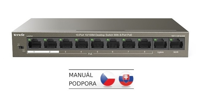 Tenda TEF1110P-8-63W přepíná data pomocí 10ti portů RJ45, 8 portů 10/100 Mb/s podporuje PoE802.3af/at + 2 porty 10/100 Mb/s pro Uplink. Switch má ochranu proti přepětí 6kV. Podpora přepojování uzlů v módu Store-and-Forward. Full-duplex kontrola toku 802.3x, half-duplex kontrola toku v režimu Back-Pressure. Dva Uplink porty je možné využít na připojení switche do sítě a druhý na připojení dalšího zařízení bez PoE, např. NVR a další.