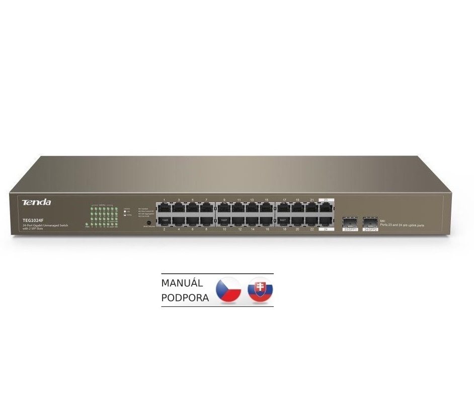 Tenda TEG1024F přepíná data pomocí 24 portů RJ45 a 2 portů SFP pro připojení optiky, 22 portů 10/100/1000 Mb/s RJ45 + 2x Combo SFP/RJ45 (SFP rychlost 1000Mb/s a RJ45 rychlost 10/100/1000 Mb/s). Switch má ochranu proti přepětí 6kV. Podpora přepojování uzlů v módu Store-and-Forward. Full-duplex kontrola toku 802.3x, navíc podporuje energeticky úspornou normu 802.3z.